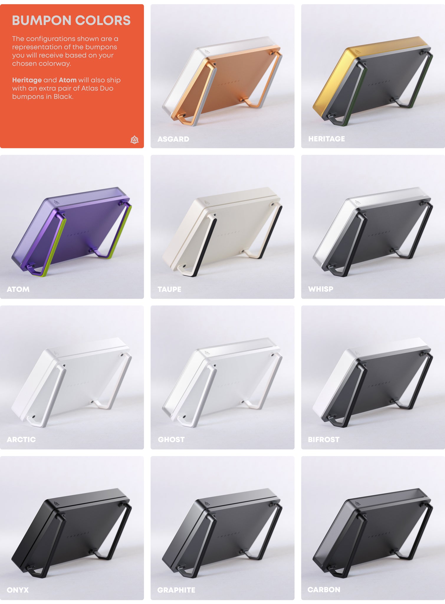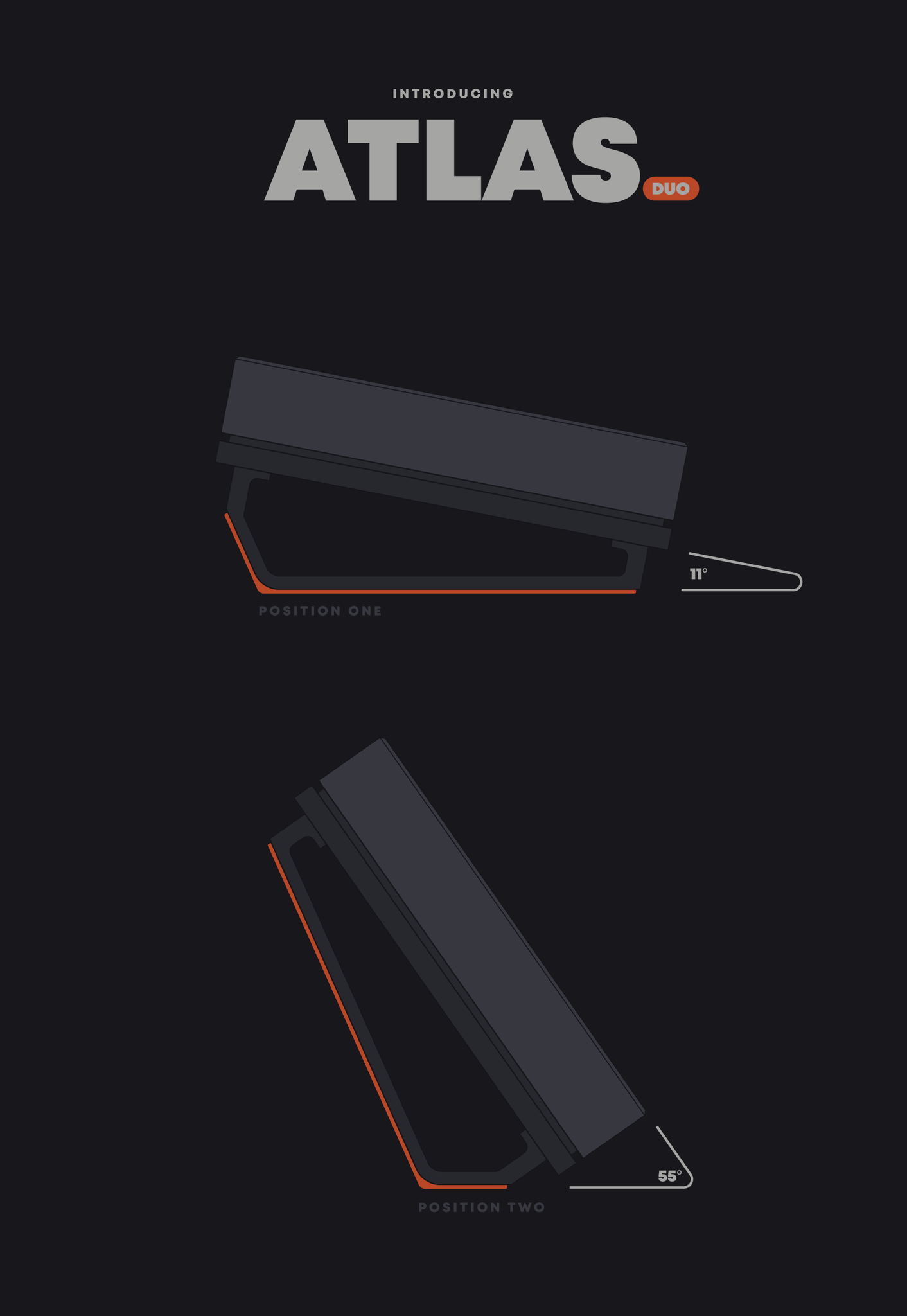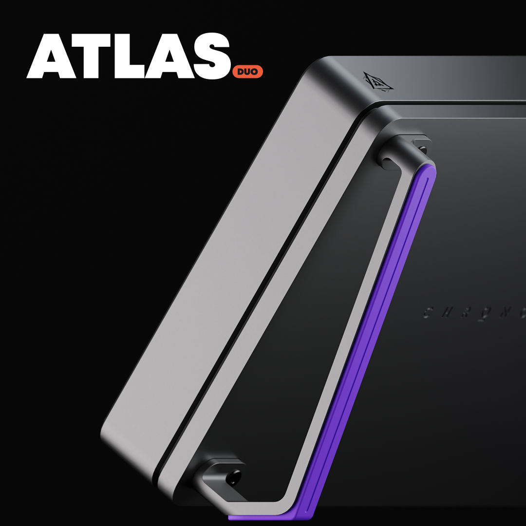 - Atlas Duo with mounting screws & injection molded press-fit bumpons. Atlas Duo is a dual angle stand for your Chronos, allowing you to change the display angle to either 11 degrees or 55 degrees.